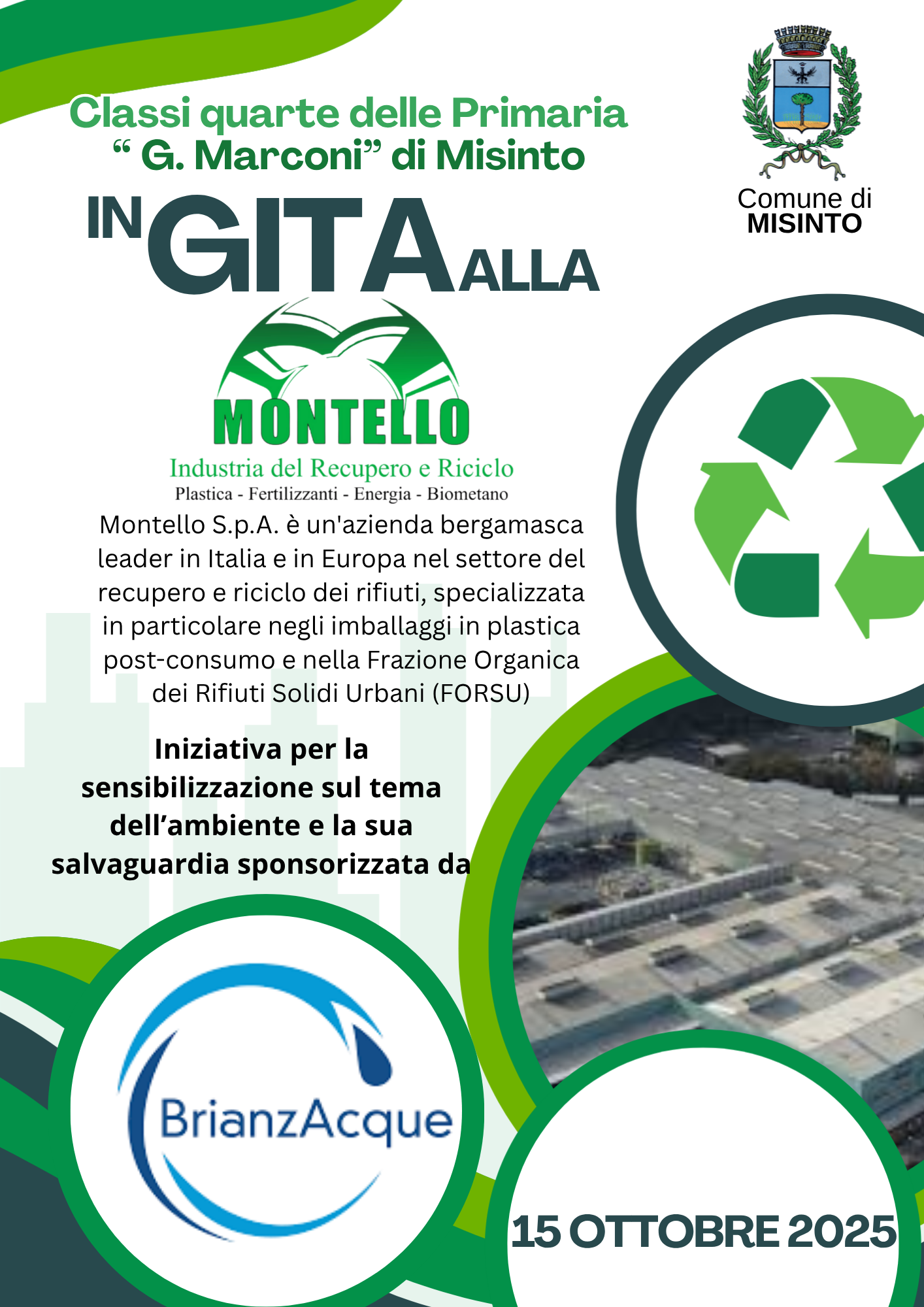 L'Amministrazione comunale di Misinto, grazie alla sponsorizzazione di Brianzacque S.r.l., ha organizzato un visita di istruzione rivolta alle classi quarte della primaria G. Marconi presso la Montello S.p.A., società bergamasca leader in Italia e in Europa per il recupero e riciclo dei rifiuti in particolare di materiali plastici ed organici.