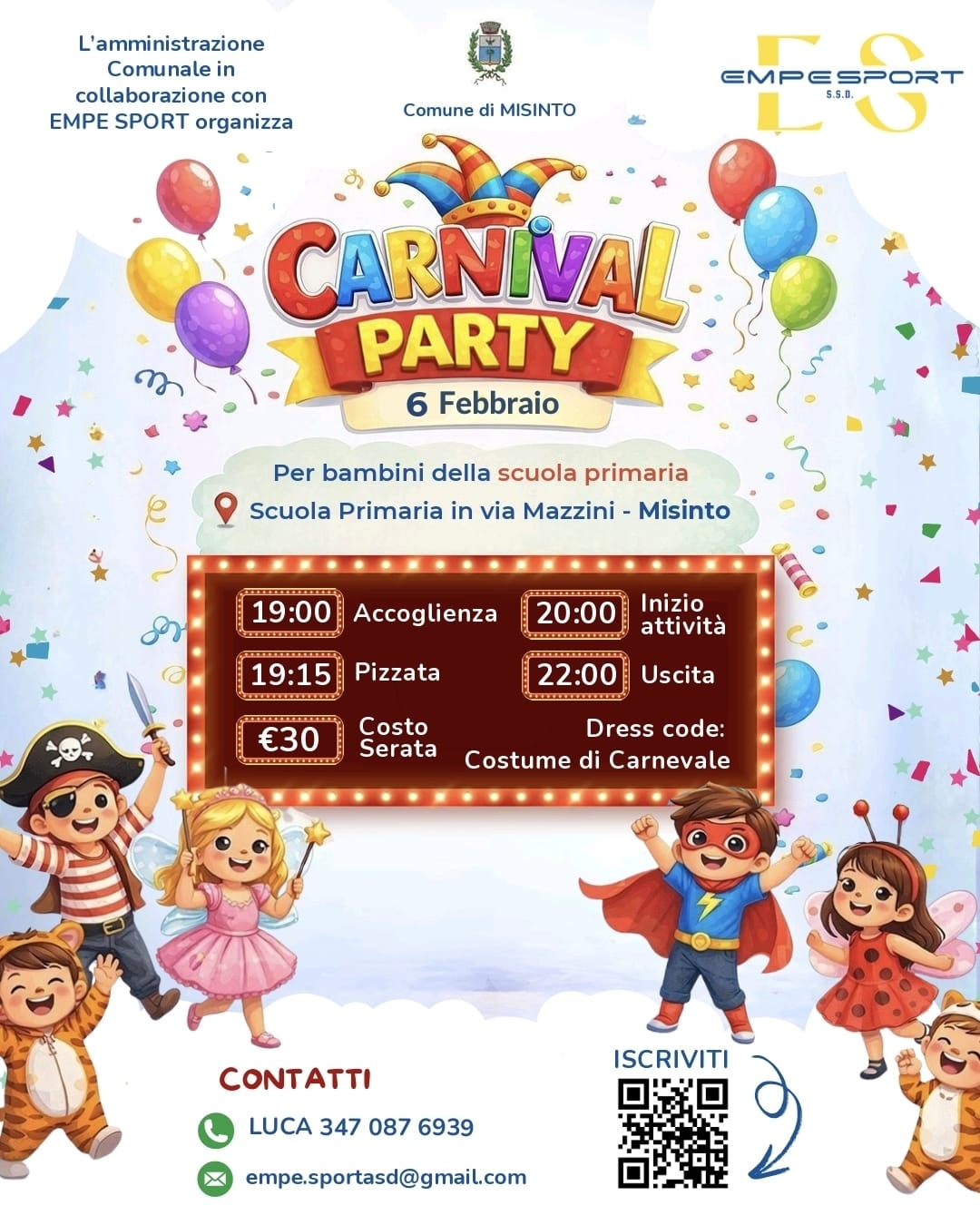 L'Amministrazione comunale di Misinto in collaborazione con ASD Empe Sport organizza per venerdì 6 febbario p.v. una serata a tema presso la scuola "G. Marconi" dalle ore 19:00 alle ore 22:00 rivolta agli alunni della primaria.