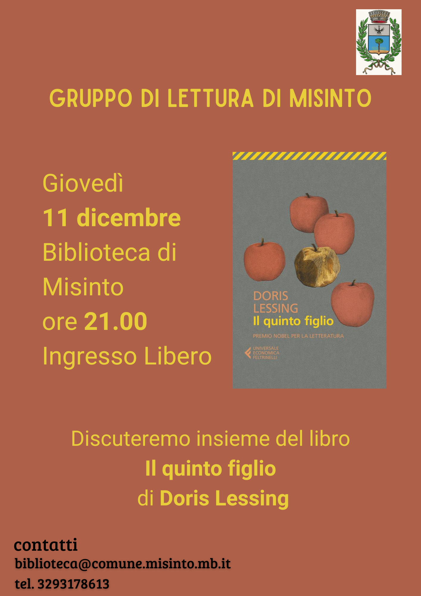 L'11 dicembre 2025 alle ore 21:00 presso la biblioteca di Misinto, l'utenza è invitata al Gruppo di lettura (GdL) per commentare il libro "Il quinto figlio" di Doris Lessing - clicca qui per informazioni e locandina