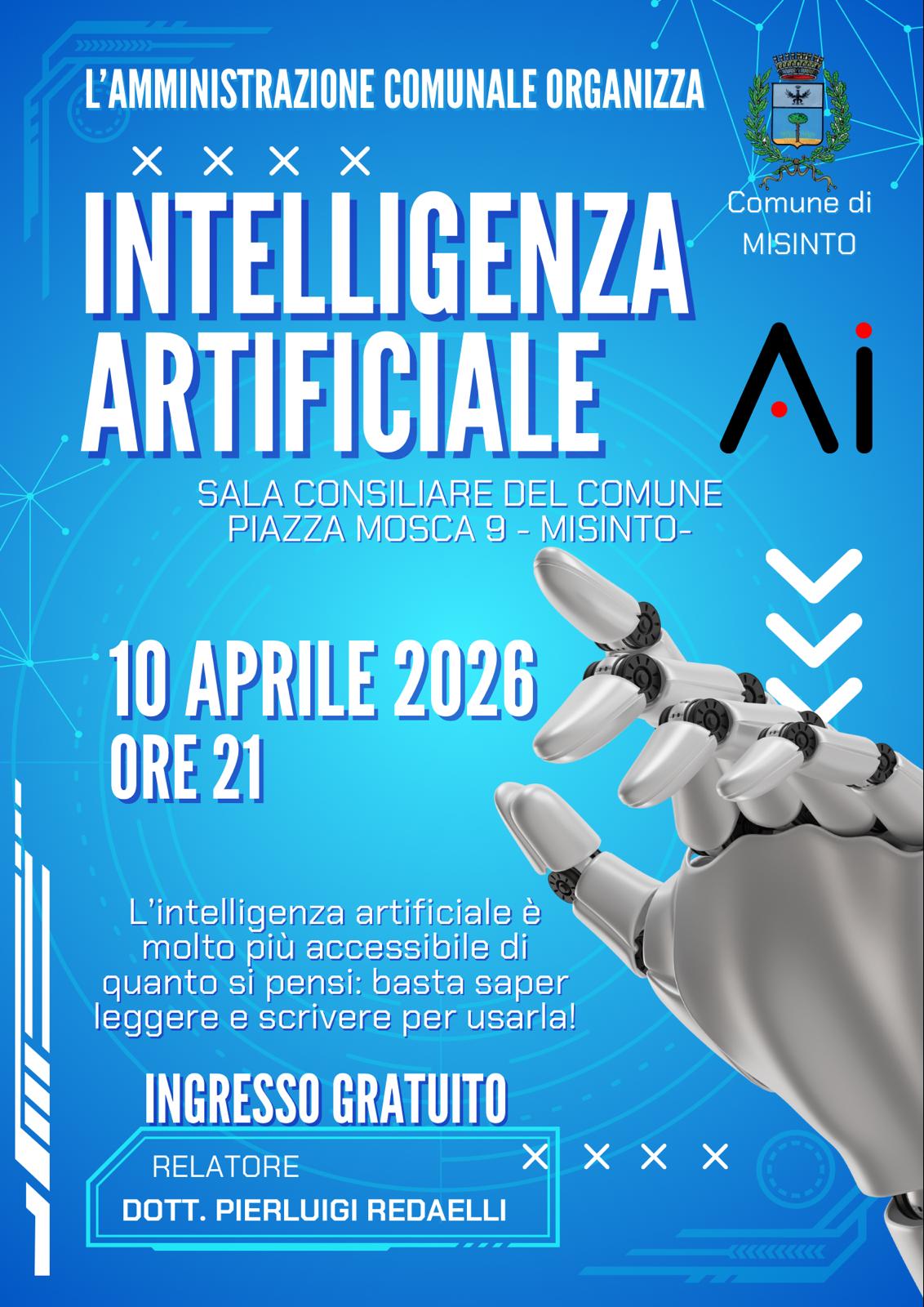 L'Amministrazione comunale organizza un incontro sull'intelligenza artificiale in data 10 aprile 2026 alle ore 21.00 presso l'Aula Consiliare del Comune di Misinto.