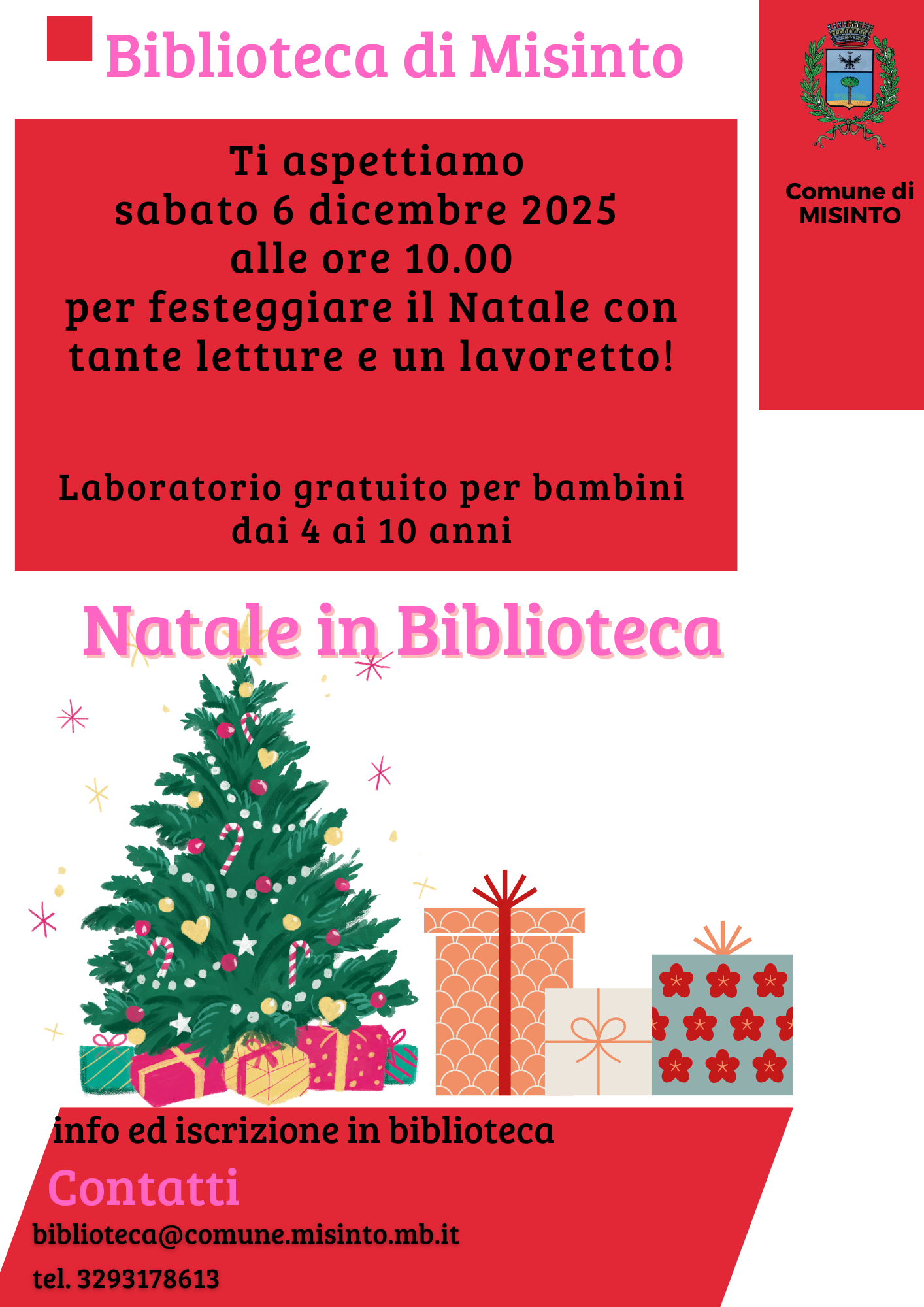 Sabato 6 dicembre alle ore 10:00 i bambini dai 4 ai10 anni potranno festeggiare il Natale in biblioteca con tante letture e un lavoretto finale.