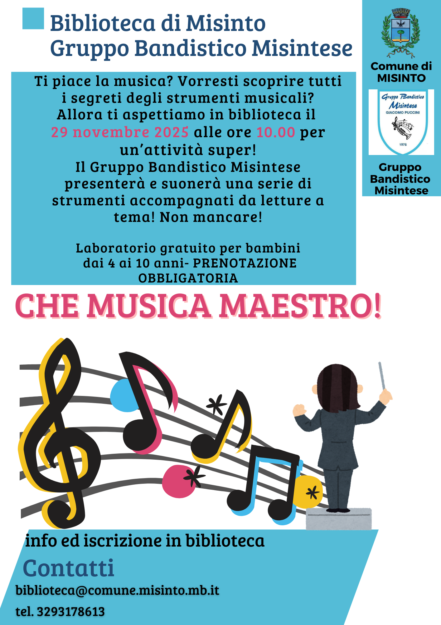 Sabato 29 novembre alle ore 10:00 i bambini dai 4 ai10 anni potranno scoprire in biblioteca i segreti degli strumenti musicali con il gruppo Bandistico Misintese che presenterà e suonerà una serie di strumenti musicali accompagnati da alcune letture.