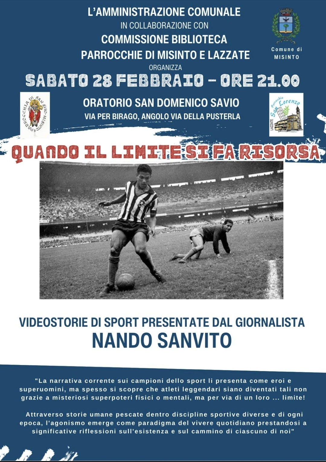 L'Amministrazione comunale, in collaborazione con la Commissione biblioteca e le parrocchie di Misinto e Lazzate organizza un incontro con il giornalista Nando Sanvito dal titolo "Quando il limite so fa risorsa" per sabato 28.02.2026 alle ore 21:00 presso il salone dell'oratorio San Domenico Savio - Via per Birago.
