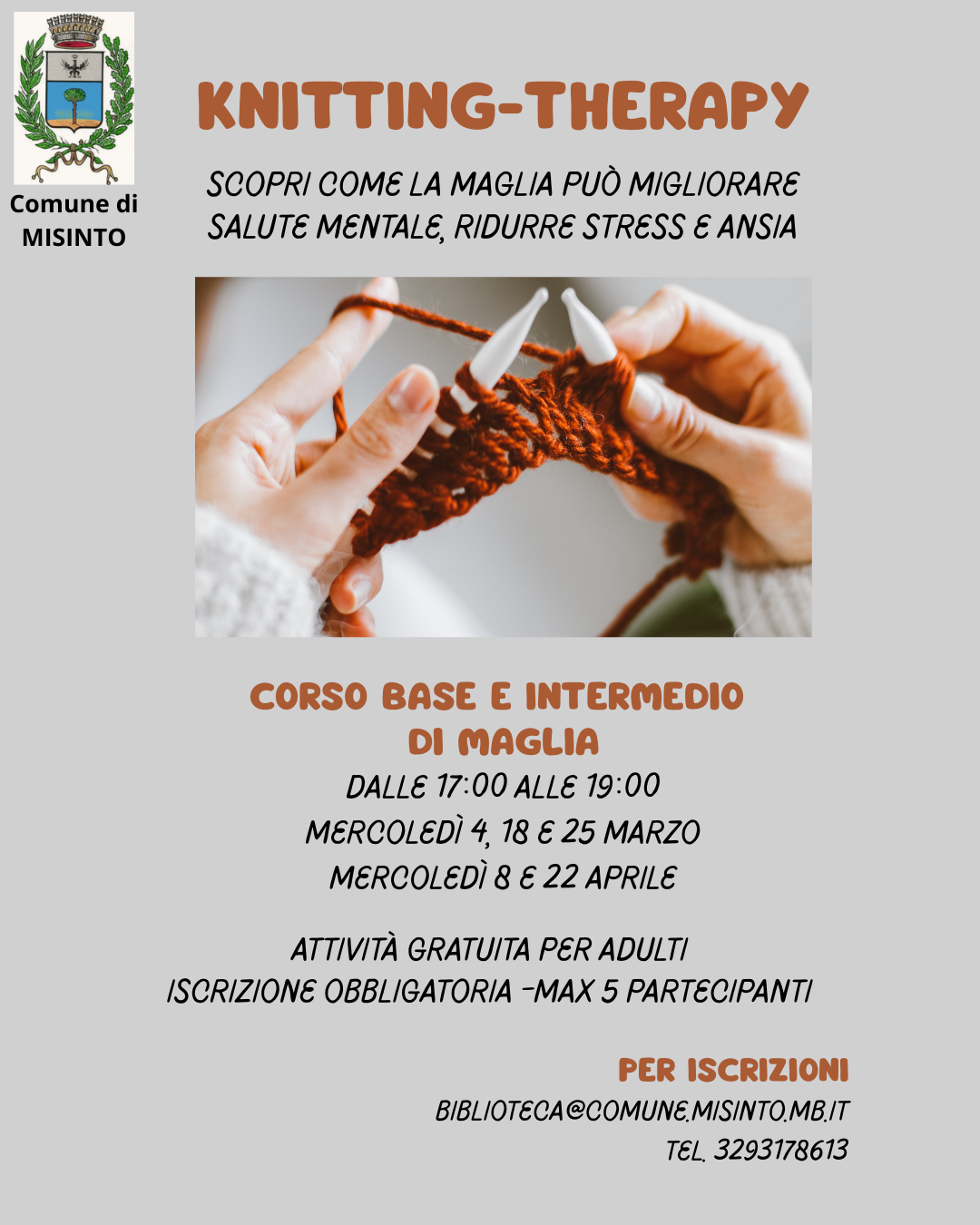 L'amministrazione comunale con la biblioteca organizza un corso base e intermedio di maglia per adulti: Knitting-Therapy