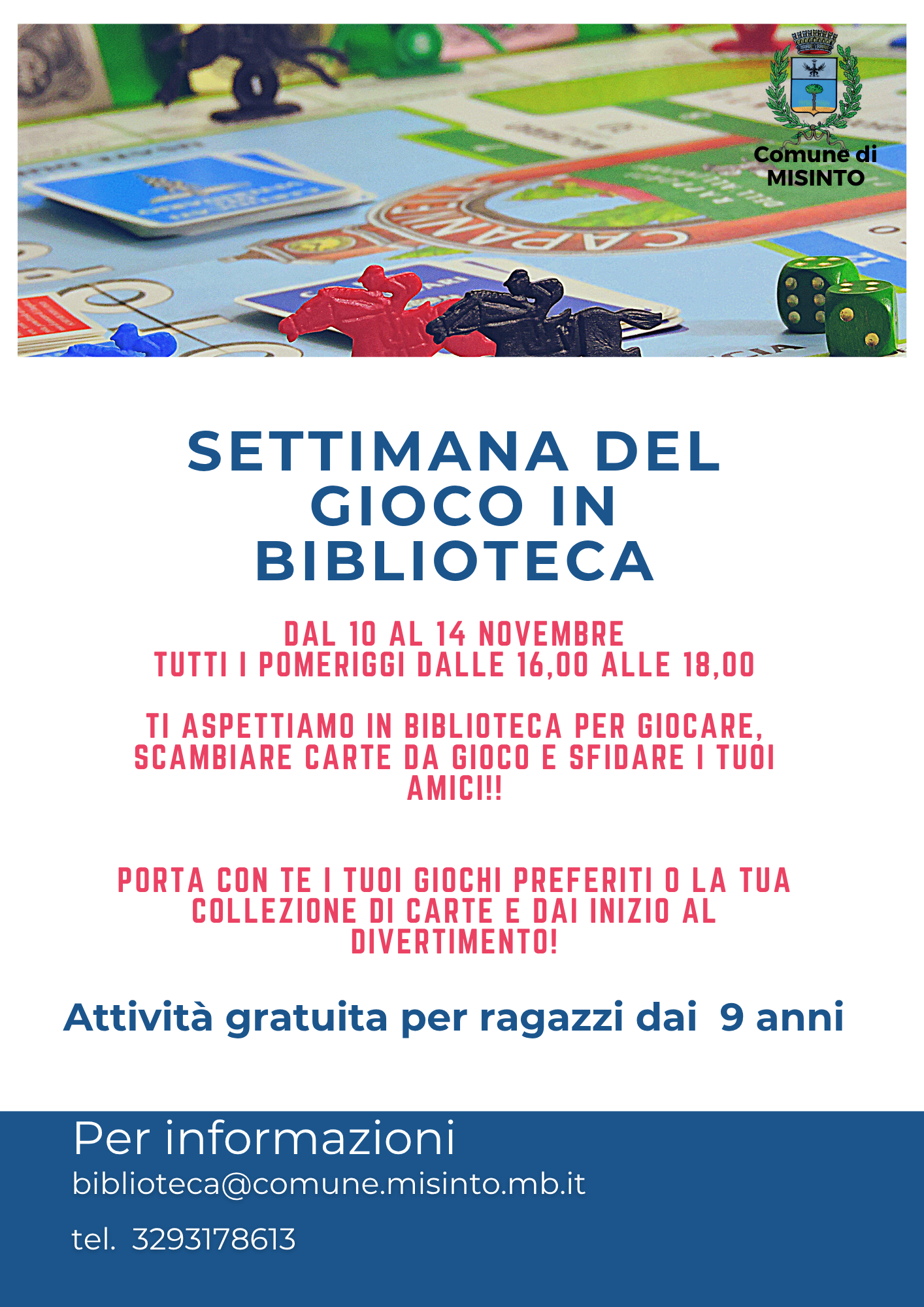 Tutti i pomeriggi dalle ore 16:00 alle ore 18:00, dal 10 al 14 novembre 2025, la Bibioteca civica propone la settimana del gioco rivolta ai ragazzi a partire dai 9 anni.